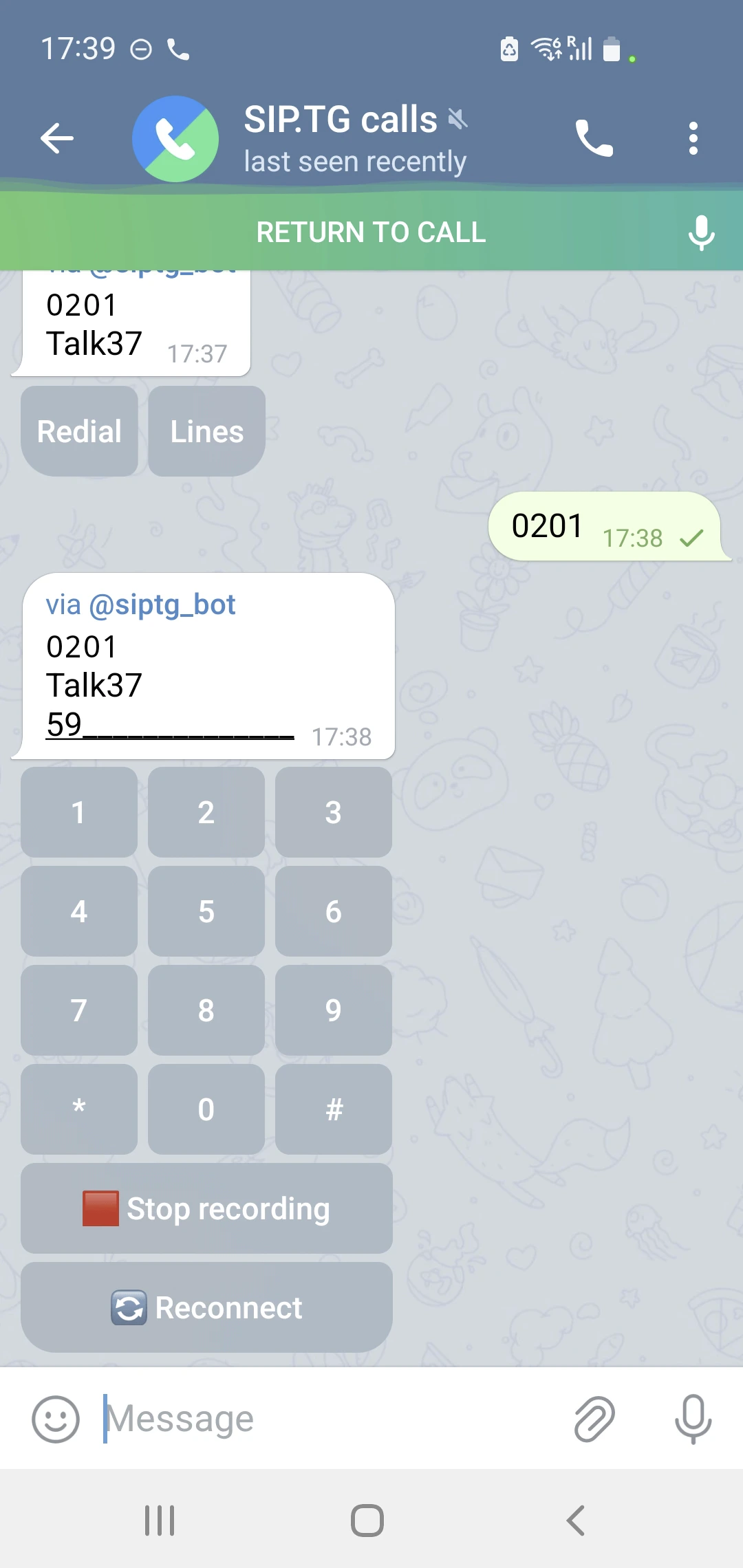 - Ағымдағы қоңырауды аяқтамай екінші шығыс қоңырауды жасау үшін @siptg чатында екінші қоңырау үшін нөмірді қарапайым хабарлама ретінде жіберіңіз.